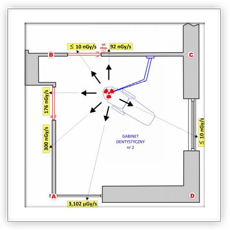 Pomiary w osłanianych miejscach wokół aparatów RTG zarówno medycznych, jak i przemysłowych wykonywane są akredytowanymi metodami badawczymi (akredytacja PCA) z użyciem nowoczesnej aparatury pomiarowej. Wyniki pomiarów przedstawiane są w sprawozdaniu w tabelach oraz na załączanych rysunkach. Przedstawiane jest też narażenie pracowników i/lub osób postronnych na promieniowanie z uwzględnieniem dopuszczalnych wartości określonych w przepisach prawnych.